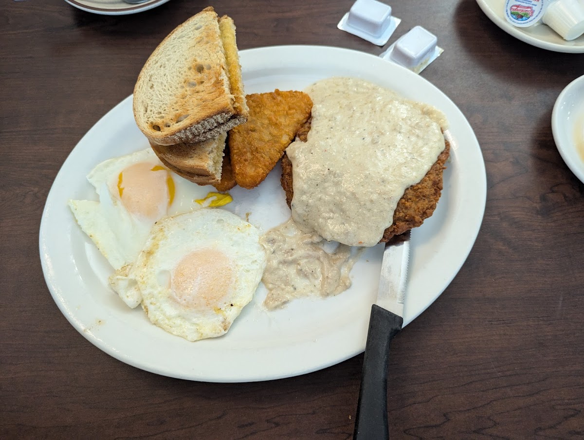 For those looking for a hearty breakfast, the Country Fried Steak Breakfast is another signature dish that hits the spot. Tender, breaded steak, smothered in creamy gravy, served with eggs and toast - it’s comfort food at its finest. Another great option is the Scrambled Eggs with Bacon, Home Fries, and Toast, a simple yet satisfying choice for a classic start to the day.